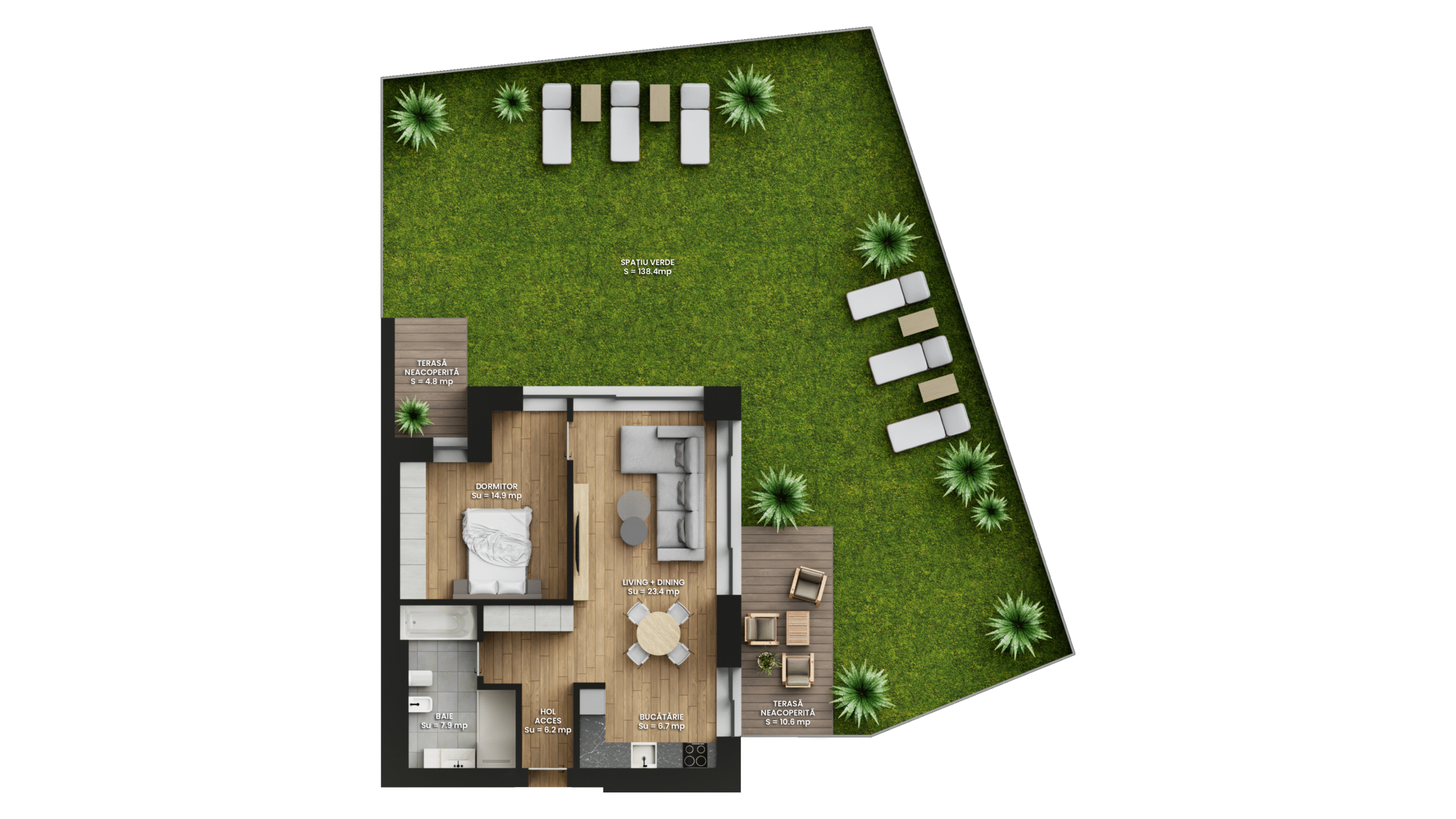 Un alt punct de atracție al ansamblului îl reprezintă terasele și grădinile private. Fie că alegi intimitatea unei grădini la parter, perfectă pentru momente de relaxare sau pentru serile petrecute alături de cei dragi, fie liniștea unei terase generoase la etaj, vei beneficia mereu de un contact direct cu natura. Aceste spații exterioare sunt concepute pentru a completa armonios apartamentele și pentru a oferi un plus de valoare și exclusivitate fiecărei locuințe.